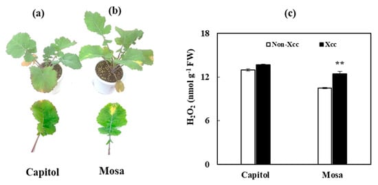 V-shaped necrotic lesion in the leaf of B. napus cultivars (a) cv. Capitol, (b) cv. Mosa and (c) H2O2 content in response Table S3. Asterisks indicate significant differences between the noninoculated Xanthomonas campestris pv. campestris (Xcc) (control) and Xcc-inoculated plants; ** p < 0.01.