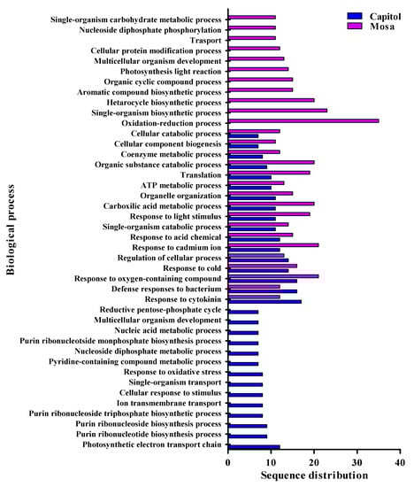 A total of 1520 proteins were obtained from the label-free LC–MS/MS proteomic analysis of Xcc-infected or healthy leaves in two B. napus cultivars with contrasting susceptibility to Xcc. It was revealed that 163 and 158 proteins were differentially expressed following Xcc infection of cv. Capitol and cv. Mosa, respectively (Figure S1). Of 321 differentially expressed proteins in two B. napus cultivars with contrasting susceptibility to Xcc, 198 were successfully annotated with gene ontology (GO) terms using Blast2GO (Tables S1 and S2). These were then sorted into different biological processes (Figure 2), including regulation of cellular process, metabolic process, defense responses to bacterium, responses to stimuli, electron transport, and major cellular component which includes chloroplast envelope, thylakoid membrane, apoplast, plasma membrane (Figure S2), as well as major molecular functions (Figure S3) such as protein binding, oxidoreductase activity, RNA binding, ATP binding, hydrolase activity, and transferase activity.