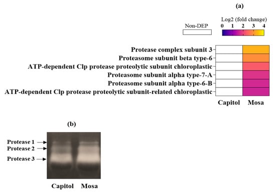 Differentially accumulated proteins involved in proteolysis in Brassica. napus cultivars (cv. Mosa) in responses to Xanthomonas campestris pv. campestris (Xcc). (a) Significantly expressed proteins (fold changes of ≥ 1.5 and ≤ 0.5 with p < 0.05, upregulated and downregulated, respectively) are presented as Log2 fold changes (Xcc/Non-Xcc). DEP—differentially expressed protein; (b) in-gel staining of protease activity in resistant cultivar (cv. Capitol) and (b) susceptible cultivar (cv. Mosa) proteins in responses to Xanthomonas campestris pv. campestris (Xcc).