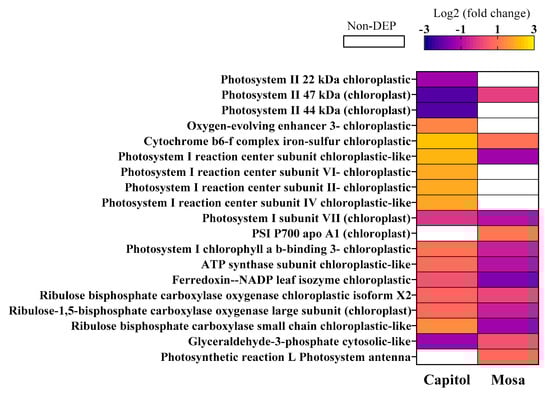 Profile of the photosynthesis-related differentially accumulated proteins in B. napus cultivars in responses to Xanthomonas campestris pv. campestris (Xcc). Significantly expressed proteins (fold changes of ≥ 1.5 and ≤ 0.5 with p < 0.05, upregulated and downregulated, respectively) are presented as Log2 fold changes (Xcc/Non-Xcc). DEP—differentially expressed protein.