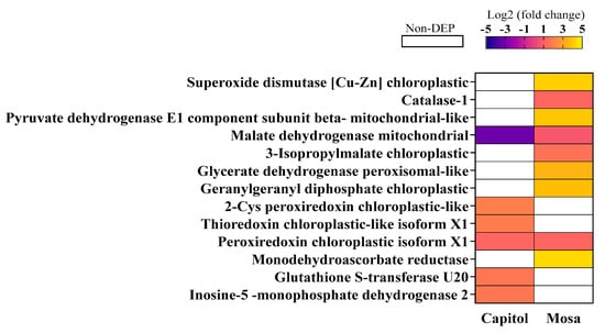 Reactive oxygen species (ROS) and redox-related differentially accumulated proteins in B. napus cultivars in response to Xanthomonas campestris pv. campestris (Xcc). Significantly expressed proteins (fold changes of ≥ 1.5 and ≤ 0.5 with p < 0.05, upregulated and downregulated, respectively) are presented as Log2 fold changes (Xcc/Non-Xcc). DEP—differentially expressed protein.