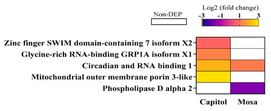 Among the identified proteins in the resistant cultivar cv. Capitol, three proteins are involved in immune responses, including zinc finger SWIM domain-containing 7 isoform X2 (ZFD), glycine-rich RNA-binding GRP1A isoform X1, and mitochondrial outer membrane porin; these were significantly upregulated in the resistant cultivar cv. Capitol in response to Xcc. However, in the susceptible cultivar cv. Mosa following Xcc inoculation, phospholipase D alpha 2, which is a secondary signaling protein in plant innate immune responses, was significantly repressed (Figure 6).
