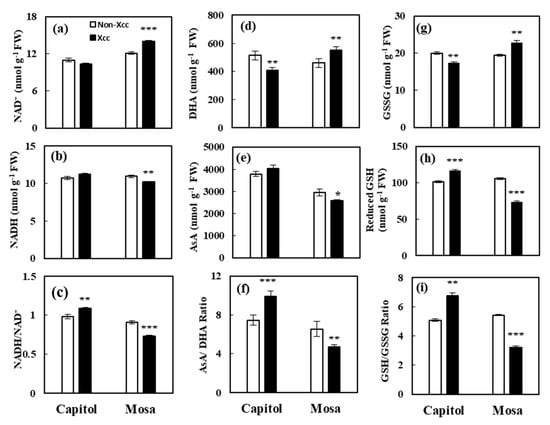 Xcc inoculation altered the NADH-, glutathione-, and ascorbate-based redox statuses in both resistant and susceptible cultivars (Figure 7). NAD+ (p < 0.001), dehydroascorbate (DHA; p < 0.01), and oxidized glutathione (GSSG; p < 0.01) contents were significantly increased by Xcc inoculation in the susceptible cultivar cv. Mosa (Figure 7a,d,g). The reduced form of glutathione was markedly enhanced in the Xcc-inoculated resistant cultivar (cv. Capitol) compared to non-Xcc-inoculated plants (Figure 7h). The resulting NADH/NAD+, AsA/DHA, and GSH/GSSG ratios significantly increased in the resistant cultivar (cv. Capitol), whereas these ratios decreased significantly in the susceptible cultivar (cv. Mosa) in response to Xcc infection (Figure 7c,f,i).