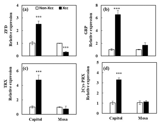 The relative expression of immune response and redoxregulating genes were upregulated in the resistant cultivar (cv. Capitol), including zinc finger SWIM domain-containing 7 isoform X2 (ZFD, + 147.1%; Figure 8a), glycine-rich RNA-binding GRP1A isoform X1 (GRP, + 538.3%; Figure 8b), thioredoxin (TRX, + 364.3%; Figure 8c), and 2-cys peroxiredoxin (2 Cys-PRX, + 222.3%; Figure 8d), whereas ZFD was repressed (−70.1%) in the susceptible cultivar (cv. Mosa) in response to Xcc inoculation (Figure 8a).