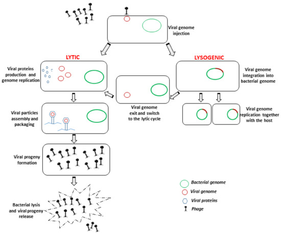 Bacteriophages are extremely specific towards their host, since they infect a specific species or even a specific strain, and this is determined by the nature as well as the structure of the receptors that are present on bacterial cell surfaces which interact with the phage antireceptor [13]. Once nucleic acid is injected into the host, and since they are completely free of their own molecular machinery, phages use the bacterial cell machinery to reproduce themselves, and for this reason they are defined as obligate intracellular parasites. Based on the life cycle that they can establish on the prokaryotic host, phages can be virulent or temperate (causing a lytic or lysogenic infection, respectively). The lytic cycle occurs when virulent phages infect and rapidly multiply within the host bacteria to produce viral progeny. This cycle results in the release of newly formed progeny virions by lysis of the host cell, mediated by phage-encoded enzymes able to degrade the bacterial cell wall. By contrast, temperate phages integrate their nucleic acid into the host genome, and remain in the host in a dormant stage (prophage). This type of infection is named lysogenic, and bacterial cells that are lysogenized by temperate phages acquire resistance against infection by lytic phages. The prophage can stably reside within the host cell for long periods of time until the appropriate physiological or environmental conditions favor the reactivation of the lytic lifecycle [14] (Figure 1).
