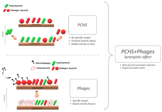 On the other hand, bacteriophages are not particularly resistant in a dry environment, therefore the decontamination would be unlikely to originate a stable abatement of the targeted pathogens. Based on the complementary characteristics of bacteriophages and probiotics, a potential synergistic effect of a combined system was therefore hypothesized (Figure 2).
