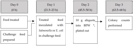 One day after product application, for each combination of product plus concentration, 10 g of the challenge feed was mixed with 990 g of the treated layer mash feed for five minutes in a laboratory mixer, then held at room temperature (approximately 19 °C) for 24 h. Then, 10 samples of 10 g were taken from each treated batch and each was suspended in 90 mL buffered peptone water (BPW). An aliquot of 100 µL was plated onto xylose lactose Tergitol™ 4 agar (XLT-4; 223410, Difco, Oxford, UK) for Salmonella, or ESBL chromogenic agar (CHROMagar ESBL, Paris, France) for E. coli. Plates were incubated for 18 h ± 2 h at 37 °C and colony numbers were counted. Up to three replicate plates were made for each 10 g sample, providing a mean count per sample. A negative control of untreated layer mash feed mixed with un-inoculated MBM was included, along with a positive control of untreated but experimentally contaminated feed.