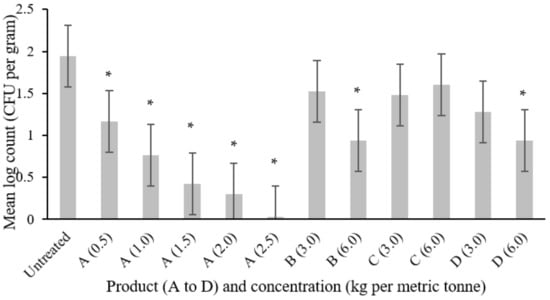 Log10 count of Salmonella DT104 in feed treated with each product after 24 h contact with products as described in Table 2. * indicates statistically significant difference from the untreated control using Dunnett’s comparison. Error bars indicate 95% confidence intervals.