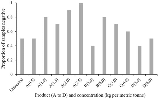 With product A, a concentration-dependent increase in the proportion of negative samples was observed (Figure 2; p = 0.004). There was no significant difference in the proportion negative between products regardless of concentration, despite there appearing to be an increase in negative samples in feed treated both with product A and with the higher (6.0 kg MT−1) concentration of product B. There appears to be little evidence of an effect for products C and D.