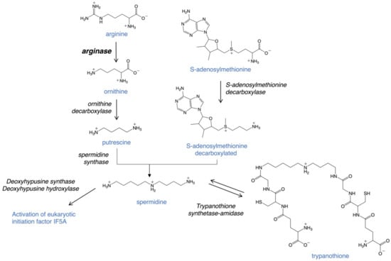 Polyamines are ubiquitous polycations that play critical roles in a variety of key processes, including growth, differentiation and macromolecular synthesis. In Leishmania parasites, arginase catalyzes the conversion of the essential amino acid arginine to ornithine (Figure 2). Unlike in mammalian host cells, which contain two arginase enzymes, only one arginase gene exists in Leishmania and the sole essential role of ornithine is as precursor for polyamine biosynthesis [,,,]. Ornithine is converted to the polyamine putrescine by the enzyme ornithine decarboxylase and putrescine is further metabolized to spermidine by spermidine synthase. Decarboxylated S-adenosylmethionine, generated by S-adenosylmethionine decarboxylase, donates the aminopropyl group for spermidine formation. Both putrescine and spermidine are positively charged under physiological conditions. Polyamines are essential for parasite viability and as precursors for the formation of trypanothione and hypusine. Trypanothione is a unique thiol formed in trypanosomatids by conjugating two molecules of glutathione to spermidine. The bifunctional enzyme trypanothione synthetase-amidase catalyzes the biosynthesis and hydrolysis of trypanothione []. This unique thiol is vital for maintaining the intracellular redox balance and for defense against oxidative stress [,,,]. In addition, spermidine is the precursor for the hypusination and activation of eIF5A, which is essential for both Leishmania parasites and in the mammalian host [,,,].