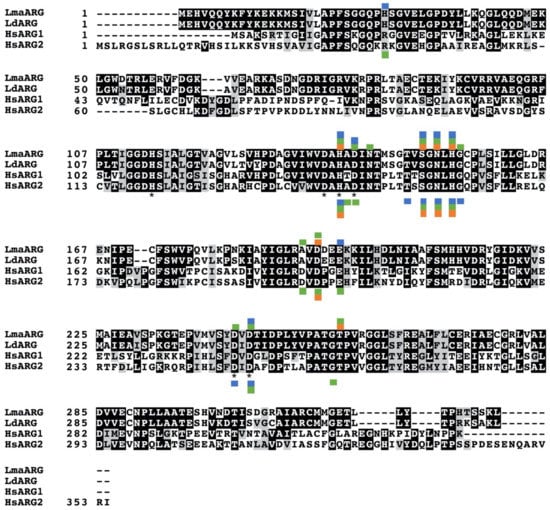 Sequence alignment of leishmanial and human arginases. LmaARG: L. mexicana amazonensis arginase, sequence ID AAC95287.1; LdARG: L. donovani arginase, sequence ID XP_003864734.1; HsARG1 Homo sapiens arginase 1, sequence ID NP_001231367.1; HsARG2: Homo sapiens arginase 2, sequence ID NP_001163.1. Sequences were aligned using the Clustal Omega tool. Residues in the multisequence file that were identical or similar between the four sequences were highlighted in black or grey, respectively, using Boxshade. Residues marked with the asterisk were identified as key sites from the first published report of the crystal structure of L. mexicana arginase []. Boxes above the sequence alignment denote residues where docking studies have indicated that inhibitors bind to leishmanial arginase, whereas boxes below the sequence alignment denote residues where inhibitors bind to host arginase (human or rat). Blue boxes designate sites where flavonols bind (quercetin and fisetin), green boxes show sites where green tea components bind (C, EC, ECG, and GA), and orange boxes indicate sites where cinnamic acids bind (caffeic acid, rosmarinic acid, and chlorogenic acid).