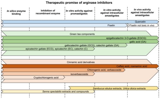 - Garcia, A.R.; Oliveira, D.M.P.; Amaral, A.C.F.; Jesus, J.B.; Sodero, A.C.R.; Souza, A.M.T.; Supuran, C.; Vermelho, A.B.; Rodrigues, I.A.; Pinheiro, A.S. Leishmania infantum arginase: Biochemical characterization and inhibition by naturally occurring phenolic substances. J. Enzym. Inhib. Med. Chem. 2019, 34, 1100–1109. [Google Scholar] [CrossRef]