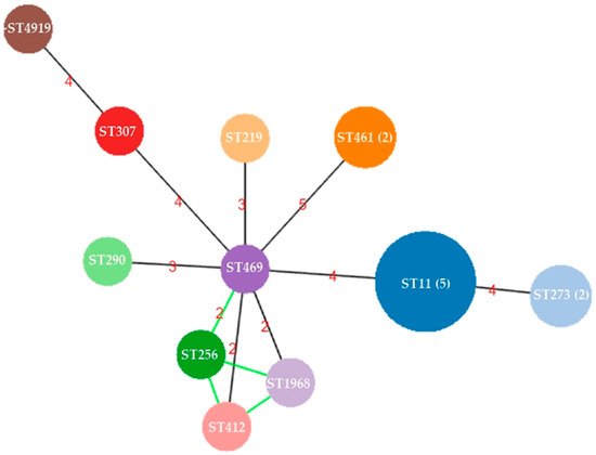 - Ribeiro-Goncalves, B.; Francisco, A.P.; Vaz, C.; Ramirez, M.; Carrico, J.A. PHYLOViZ Online: Web-based tool for visualization, phylogenetic inference, analysis and sharing of minimum spanning trees. Nucleic Acids Res. 2016, 44, W246–W251. [Google Scholar] [CrossRef]
