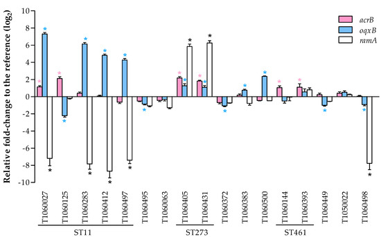 - Bialek-Davenet, S.; Lavigne, J.P.; Guyot, K.; Mayer, N.; Tournebize, R.; Brisse, S.; Leflon-Guibout, V.; Nicolas-Chanoine, M.H. Differential contribution of AcrAB and OqxAB efflux pumps to multidrug resistance and virulence in Klebsiella pneumoniae. J. Antimicrob. Chemother. 2015, 70, 81–88. [Google Scholar] [CrossRef] [PubMed]