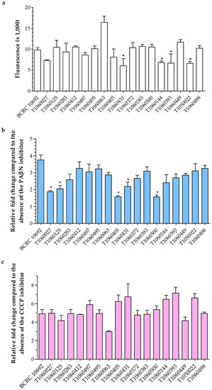 Membrane permeability by using fluorescence dye (Hoechst 33342) accumulation in the absence and presence of the efflux pump inhibitors (EIs) PAβN and CCCP. (a) Fluorescence values of each isolate were detected in the absence of EIs. (b) and (c) Fold changes in each isolate were calculated from the fluorescence values in the presence of individual EIs divided into those in the absence of EIs. The asterisk (*) indicates a significant difference compared to the reference BCRC 10692 (p ≤ 0.05).
