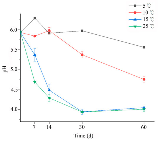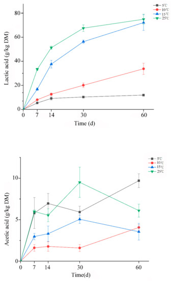 The changes of pH and organic acid during ensiling process were shown in Figure 1 and Figure 2, respectively. As we known, the rate of pH decline is considered as an important indicator for reflecting the microbial activity and silage fermentation quality. In this regard, our results confirmed that the low temperature could restrict the silage fermentation. Because Figure 1 clearly showed that the rate of pH decline at 25 °C was higher than other treatments. Besides, at the temperature 5 °C, the silage acidification was greatly delayed, and the rate of decline was the slowest among all the treatments. Zhou et al. reported that sufficiently low pH values were eventually reached even if whole-plant corn silages were stored at 5 °C or 10 °C [7]. However, the final pH values at the same storage temperature were still around 5–6 after 60 days of ensiling in this study. This could be due to the good ensilage properties of whole-plant corn. In addition, a decline trend of pH was observed in silages at 5 °C and 10 °C during the whole ensiling time, which might indicate that prolonging storage time can contribute to the acidification of oat silage at low fermentation temperature.