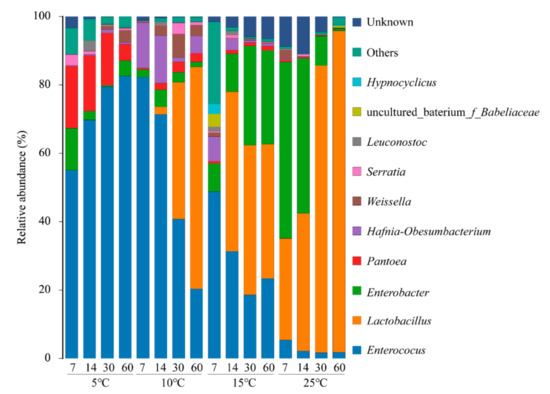 The bacterial community of oat silage at the genus level was shown in Figure 3. Results of our research clearly demonstrated the different profiles of bacterial population diversity during ensiling process in relation to storage temperature. The main genera in 5 °C silages were Enterococcus and Pantoea, accounting for beyond 70% of total bacteria. At 10 °C, Enterococcus and Hafnia-Obesumbacterium were the dominant bacteria at the primary period, then replaced by Lactobacillus and Enterococcus. Enterococcus, a kind of cocci-shaped LAB, is usually present in silage fermentation. Several studies have shown Enterococcus played an important role in accelerating the silage fermentation, but Enterococcus could survive only in the early stages of fermentation due to its non-acid resistance characteristic [2,11]. Therefore, its high abundance means the low lactic acid content in silage, which is similar to our finding in silage at 5 °C. Lactobacillus play a critical role in reducing silage pH at the later stage. After 60 days of ensiling, Lactobacillus abundance became the highest among all the general at 10 °C, while its lactic acid content was much lower than at 15 °C and 25 °C. However, the lactic acid content at 10 °C presented constant increase trend during the whole ensiling process. That indicated if the time for oat ensiling at 10 °C was prolonged, the lactic acid content will continue to rise with the motivation of Lactobacillus. Pantoea was mainly detected in pre-ensiled fresh materials, such as forage soybean, guinea grass, and alfalfa, but Hafnia-Obesumbacterium was seldom found in fresh forage or silage. Until now, the roles of Pantoea and Hafnia-Obesumbacterium during ensiling process have not been extensively studied.