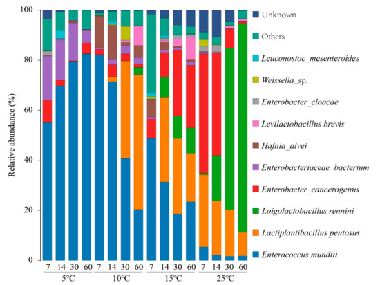 The relative abundance of silage bacteria at the species level was shown in Figure 4. E. mundtii was the predominant species in silages at 5 °C, and also dominated in the silages at 10 and 15 °C. Bigwood et al. observed that E. mundtii could control the growth of Listeria monocytogenes at low temperatures (5 °C and 10 °C), indicating a potential application in chilled foods [29]. Klein reported that E. mundtii is mostly isolated from plant-related samples, thus, this species produces bacteriocins that are expected to be especially suitable for preservation of plant-related fermentation products [30]. These results showed that E. mundtii not only could adapt to the low temperature environment in oat silage, but also have the inhibitory ability against undesirable microorganism. In this regard, the role of E. mundtii in silage fermentation of low temperature deserves further study.
