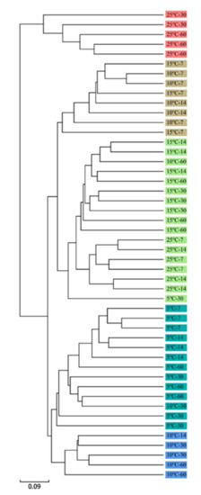 The chemical composition and microbial population of oat silage after 60 days of ensiling were shown in Table 2. Although all temperature treatments did not show significant difference on the contents of DM and NDF, significant impacts on the CP and ADF were observed. The observed less CP content in low temperature (5 °C and 10 °C) was similar to the report by Zhou et al. [7]. That could be ascribed to the insufficient silage fermentation in lower temperature, such as delayed acidification and lower rate of pH decline (Figure 1). However, we could not classify the reason behind why lower ADF of silages also appeared at 5 °C. Silages fermented at 25 °C had lower LAB count than other treatments, which could be the final lower pH values inhibiting the growth of LAB. Yeast is often considered as the primary initiators for causing aerobic spoilage. In this study, yeast and molds were not detected in all silages after 60 days of ensiling. Usually, the growth of yeast can be inhibited under anaerobic condition, especially after long time storage. Besides, the production of organic acid could further suppress its growth. Coliform bacteria have often been identified in alfalfa, corn and forage soybean silages [11,27], and its presence is usually associated with nutrition loss. Although a significant difference in coliform bacteria counts was found between different temperature treatments, their counts were detected at a low level, ranging around 102–103 cfu/g FM−1. Besides, at such low temperatures, the metabolic activity of coliform bacteria could be very low [28].