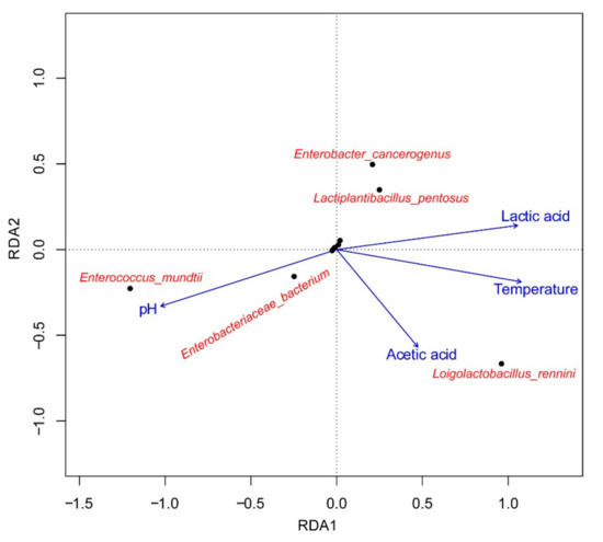 Cluster analysis was performed in order to acquire an overview of bacterial community at different storage temperature and ensiling time (Figure 5). Basically, the silage samples at 5 °C can be well separated from other treatment silages, indicating that little variation in bacterial composition occurred during ensiling process of oat at 5 °C. For silage at 25 °C, the samples ensiled for 7 and 14 days were clearly distinguished from at 30 and 60 days. It could be ascribed to the sudden increase of L. rennini abundance after 14 days of ensiling. Based on the RDA analysis (Figure 6), the obvious relationship between bacterial community at a species level and major fermentation products are visualized. L. rennini had a far position distance with L. pentosus and Enterobacter species, indicating that L. rennini might be a crucial indicator for affecting silage fermentation. The far distance among different bacterial species indicated that temperature had a significant impact on silage quality and microbial community.