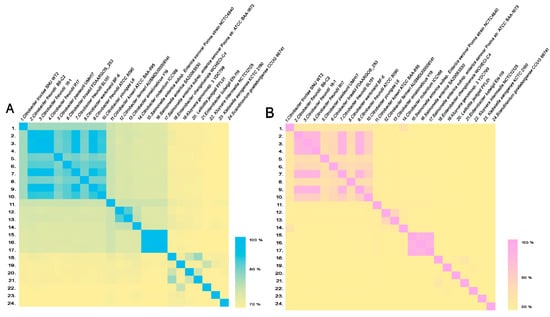 Heat map of average nucleotide identity (ANI) values and genome-to-genome distance calculator (GGDC) values compared among 24 related strains. (A) ANI heat map. (B) GGDC heat map. ANI and GGDC values are indicated by the color intensity. The strain numbers in Figure 1 are the same as that in Table 1.