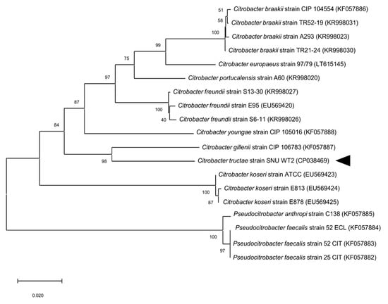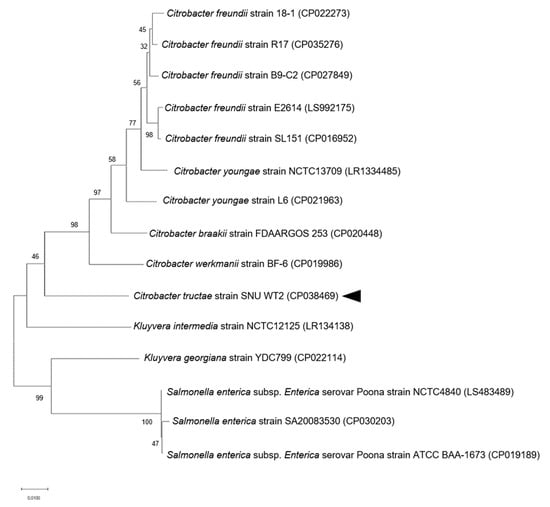 Phylogenetic tree based on four housekeeping genes (gyrB (DNA gyrase), rplB (ribosomal protein L2), fusA (elongation factor G), and leuS (tRNA synthetase)) of the Citrobacter species: the maximum-likelihood method was used for the tree construction in MEGA 7.0 [29]. The bootstrap values obtained after 1000 replicates are provided at the nodes. Bar, 0.01 changes per nucleotide position. The arrow head indicates SNU WT2.
