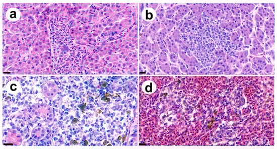 Histopathological analysis revealed major lesions induced by the infection. Among the main commonly observed lesions was bacteremia of the liver (Figure 4a), which occurred surrounding hepatocyte necrosis in a multifocal area (Figure 4b). In addition, in the kidney, multiple hyaline droplet accumulations in the tubular epithelium were observed, with infiltration of mononuclear cells and macrophages surrounding the infected tubules (Figure 4c). Further, signs of peritonitis in the spleen, including macrophage infiltration, were apparent with a necrotizing area showing lesions on the liver (Figure 4d). Overall, the infection affected and damaged the major organs (liver, spleen, and kidney) with bacteremia, which was also observed in the hepatic vein of diseased fish.