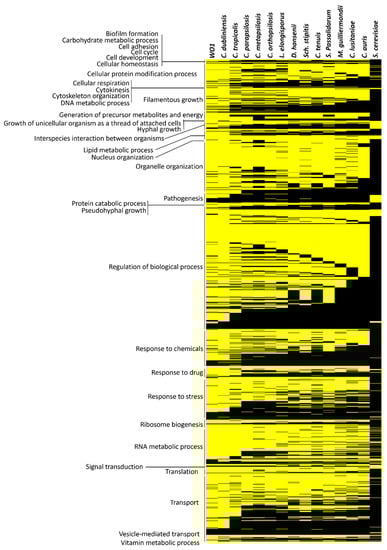 Conservation of functionally related clusters in divergent fungal lineages. The functionally clustered gene pairings from Candida albicans were analyzed for conservation of the pairings. The heat map depicts the conservation with either yellow (conservation of the pairing) or black (no conservation of the pairing).