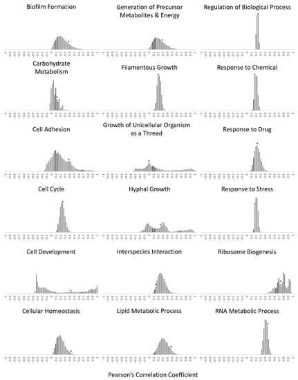 Previous studies in yeasts have characterized the set of clustered genes as distinct from the many possible clustered combinations that could have arisen by evolutionary chance [42]. In order to test the transcriptional effect of clustering to that of all the genes that could have been grouped together, a bootstrapping analysis was performed with the actual grouping’s PCC denoted with an asterisk (Figure 2). By extending this type of analysis to the Candida albicans clustered genes set, we report a significant number of grouping combinations that have a tighter transcription profile than the actual paired set—even in some of the grouping classifications that contained the highest PCC values, such as ‘Ribosome biogenesis’. There is a correlation identified within the non-random clustered sets, where the ‘Biofilm formation’, ‘Carbohydrate metabolic process’, ‘Cell adhesion’, ‘Generation of precursor metabolites and energy’, ‘Lipid metabolic process’, ‘Protein catabolic process’, ‘RNA metabolic process’, and ‘Vitamin metabolic process’ all exhibit a higher than expected PCC by chance alone. The control sets (non-significant genomic distribution) that include the ‘Regulation of biological process’, ‘Response to drug’, and ‘Response to stress’ do not exhibit the same pattern. It is interesting that in all cases, the actual clustered sets all exhibit a higher PCC value than the least clustered members of the sets, in many cases bordering on the threshold for statistical significance. This is consistent with the role that cis- and trans-factors play in coordinating the transcription of each functional set of genes, with spatial positioning potentially reinforcing this process during the stress conditions explored in our analysis.
