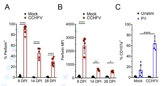 A key function of CD8+ T-cells in control of viral infections is targeted killing of virally-infected cells and perforin- and granzyme-mediated killing is the primary mechanism by which cytotoxic T-cells kill target cells [,]. On day 8 PI, 90% of CD8+ T-cells in the liver of CCHFV-infected mice were positive for perforin expression (Figure 3A) and compared to CD8+ T-cells from mock-infected mice, had significantly increased expression of perforin (Figure 3B). At day 14 and 28 PI, we still observed significant increases in perforin+ CD8+ T-cells and perforin expression remained elevated (Figure 3A,B). Interestingly, at day 8 PI, compared to cells from mock-infected mice, we also observed a small but significant increase in perforin+ CD4+ T-cells from CCHFV-infected mice (Supplementary Materials Figure S3), suggesting that CD4+ T-cells may acquire some cytotoxic functions during CCHFV infection [,].