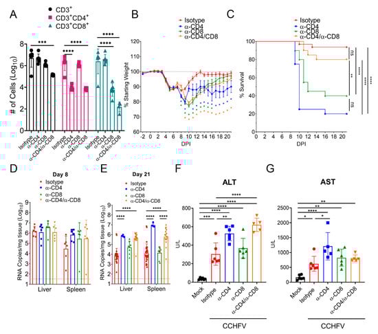 T-cells are required for survival following CCHFV infection. IFNAR−/− mice were treated with antibodies to deplete CD4+, CD8+, or both CD4+ and CD8+ cells on day −2, +3, +10, and +17 relative to CCHFV challenge. (A) On day 8 PI, depletion efficacy was evaluated in a subset of mice by flow cytometry to enumerate number of CD3+, CD3+CD4+, or CD3+CD8+ T-cells in the liver. N = 6 per group. p values calculated with two-way ANOVA with Tukey-s multiple comparisons test. (B) Following CCHFV challenge, mice were weighed daily and monitored for survival (C). n = 20–32 mice per group. (B) Error bars indicate standard error of measurement. Statistical test comparing isotype-treated mice with depleted mice was performed using a two-way ANOVA with Dunnett’s multiple comparison test. (C) Indicated statistical comparison between groups performed using Log-rank test with Bonferroni’s correction for multiple comparisons. ** p < 0.01, **** p <0.0001. (D,E) At indicated time-points PI, mice were euthanized and viral RNA in the liver or spleen quantified by qRT-PCR. Dashed line indicates limit of detection. Statistical comparison to isotype-treated mice performed using two-way ANOVA with Sidak’s multiple comparison test. (F,G) At day 8 PI, blood levels of alanine aminotransferase (ALT) and aspartate aminotransferase (AST) were evaluated. Indicated statistical comparisons performed using an ordinary One-way ANOVA with Tukey’s multiple comparison test. ns p > 0.05, * p < 0.05, ** p < 0.01, *** p < 0.001, **** p < 0.0001.