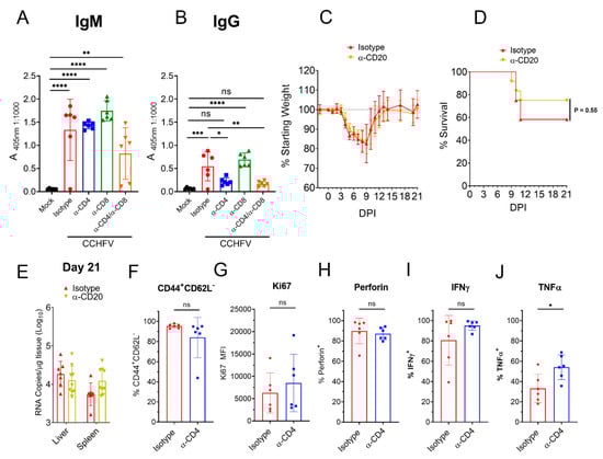 Depletion of CD4+ T-cells impairs early antibody but not early CD8+ T-cell responses. IFNAR−/− mice were infected with CCHFV and on day +8 PI CCHFV-specific IgM (A) or IgG (B) measured by whole-virion ELISA. N = 5–6 per group. Indicated statistical comparison performed with one-way ANOVA with Tukey’s multiple comparisons test. (C–E) CCHFV-infected IFNAR−/− mice were treated with α-CD20 or isotype control and weighed daily (C) and monitored for survival (D). (C,D) N = 12 per group. (D) p value calculated with Log-rank test. (E) At day 21 PI, viral loads in liver and spleen quantified by qRT-PCR. N = 6 per group. (F–J) At day 8 PI, CD8 T-cells in the liver of IFNAR−/− mice treated with isotype or antibody to deplete CD4 T-cells were evaluated for their surface expression of CD44, CD62L (F) and expression of Ki67 (G). (H) CD8 T-cells were analyzed for their expression of perforin after 4 h incubation in presence of brfA. (I,J) CD8 T-cells were analyzed for their expression of IFNγ and TNFα after stimulation with PMA/ionomycin. (F–J) N = 6 per group. Statistical test performed with unpaired t-test. ns p > 0.05, * p < 0.05, ** p < 0.01, *** p < 0.001, **** p < 0.0001.