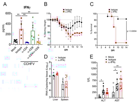 IFNγ is required for survival following CCHFV infection. (A) IFNAR−/− mice were infected with CCHFV or mock-infected. Mice were treated as indicated with isotype-control antibody, antibody to deplete CD4 or CD8 T-cells or both. On day 8 PI, plasma IFNγ levels in mice were measured by Bio-plex assay. Statistical comparison performed with a one-way ANOVA and Tukey’s multiple comparison test. (B–D) IFNAR−/− mice were infected with CCHFV and treated with isotype-control antibody or α-IFNγ antibody to neutralize IFNγ. Mice were weighed daily (B) and euthanized according to criteria outlined in methods (C). (B) N = 12 per group. Statistical comparison between isotype-control treated and α-IFNγ-treated mice performed with a two-way ANOVA with Sidak’s multiple comparison test. * p < 0.05. (C) N = 12 per group. Statistical test between survival curves performed using Log-rank test. (D) At day 8 PI, viral RNA loads in the liver or spleen were quantified by qRT-PCR. Statistical test comparing isotype-control treated and α-IFNγ-treated mice performed using two-way ANOVA with Sidak’s multiple comparison test. p > 0.05. (E) At day 8 PI, in mock-infected or CCHFV-infected mice treated with isotype control or IFNγ neutralizing antibody, blood levels of alanine aminotransferase (ALT) and aspartate aminotransferase (AST) were evaluated. Indicated statistical comparisons performed using an ordinary Two-way ANOVA with Tukey’s multiple comparison test. * p < 0.05, ** p < 0.01.