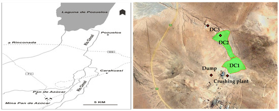 Due to the low profit margin, several metalliferous mines located in the north of Argentina have limited their activities in recent decades and many of those mines were inadequately closed. Pan de Azúcar Mine, located in the northwest of Argentina (Jujuy province), at 3700 m above sea level (22°32–22°38 S and 66°01–66°08 W) is one of them. The extractive activities for lead and silver recovery finished in 1990 [25]. The three tailings dams (DC1, DC2, and DC3) were built near the old tailings accumulated at the site. Currently, DC1 does not present signs of erosion. On the contrary, DC2 suffered strong erosion that caused it to break in different places and flow downstream covering DC3. During the wet season, water drains through the tailings forming an acid lagoon downstream. The Pan de Azúcar mine is very close to Laguna Pozuelos (National Natural Monument, Biosphere Reserve and Ramsar site) whose neutral to alkaline water hosts 44 species of birds. The Cincel River, the main tributary of the lake, connects both sites since it crosses the mining area; a little change in its composition could have a dramatic effect on the local flora and fauna of the area [26,27].