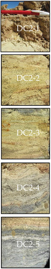 Mineral samples were taken from DC2; for this purpose, pits of approximately 1 m2 were made until reaching the basement contact (about 1–1.8 m depth). Overall, five different horizons were detected mainly based on the color of the sediment in the profile and were sampled and numbered from 1 to 5 from the surface to the maximum depth reached (Figure 2). DC2-1 is an alluvial material that covers the tailings composed of fine sand with light brown gravel containing abundant sulfides. This layer is not the original tailing but the product of the erosion of material from the surrounding area and from the surface of the dam. DC2-2 sediments are reddish-brown clays, while DC2-3 sediments are fine yellowish sands intercalated with thin layers of whitish clays. DC2-4 and DC2-5 present grey sand and clays (darker in the second sample) with abundant sulfides.