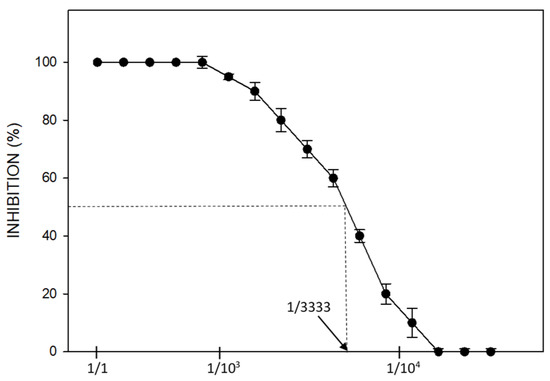 In order to determine the possible ecotoxicological influence that the acid drainage discharge could have on Cincel River, the bioassay with seeds of L. sativa L for determining acute toxicity was performed. This test uses lettuce because of its high sensitivity to many toxic species, rapid and uniform germination, and it is a cheap, simple, very versatile method that has proven to be representative of the effect of different contaminants on biological systems and, in particular, on seeds and plants [37]. In this case, the seeds were exposed to AMD-1 acid drainage by progressively diluting it with the water from Cincel River. After 120 h, the relative germination percentage was determined comparing with a control in reconstituted water with no contaminant added. In times subsequent to the one considered, additional germinations were observed in certain dilutions of the acid drainage, although without reaching the germination level of the control. Thus, in the analysis of the bioassay, the relative stem height of the seedlings after 120 h was used (referred to the control with water from Cincel River without contaminant). From these values, the half maximal inhibitory concentration (IC50) was determined, i.e., the concentration needed to inhibit a biological process (in this case, the development of the seedling) by 50%.