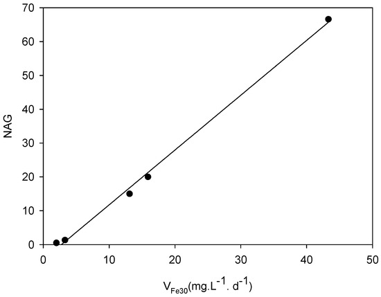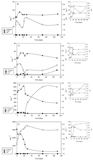 From Figure 5, two parameters were collected in order to compare with NAG to predict the generation of acid mine drainage: rate of microbial-promoted iron solubilization and pH in the solution after the time considered. In our case, we tested three different times (30, 70, and 110 days) to decide which the most convenient was in order to select the shortest possible (see Table 4).