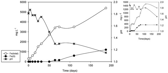 The change in slurry density used in the experiment was analyzed with the DC2-5 sample, which is the one with the highest risk of generating acid drainage within the profiles used. Figure 7 depicts the corresponding curves for a density of 5% w/v. A behavior very similar to that corresponding to the lower pulp density can be observed except that a greater solubilization is reached and the time required for this is greater than that for 2% w/v (it did not even reach a clear plateau after 150 days). In addition, lower pH values are reached, less than 1.3, which are manifested as an increase in the concentration of ferrous iron since its oxidation catalyzed by certain iron-oxidizing microorganisms such as A. ferrooxidans is inhibited in such acidic media [41]. The average rate of iron solubilization reaches a value of about 50 mg·L−1·d−1 at 30 days, which is quite close to the value reached with pulp density of 2% w/v, suggesting that pulp density in the biooxidation experiments does not limit the use of the rate of iron solubilization to predict the risk of generating acid drainage.