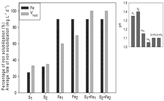 The comparison between the different systems indicates that the solubilization of iron requires the participation of an iron-oxidizing consortium (although it also contains sulfur-oxidizing species); when the consortium only contains sulfur-oxidizing microorganisms (or at least when the iron-oxidizing species do not dominate the consortium), the extraction is significantly lower (around 30% of that achieved by the other consortia). This is because, as mentioned, solubilization of the iron present in pyrite and marcasite requires an oxidizing microbial attack. The extraction of iron in the systems inoculated with the sulfur-oxidizing consortia increases after 60–80 days of biooxidation, which could indicate the activity of native iron-oxidizing microorganisms present in the sediments (which had not been sterilized).