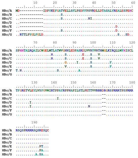Amino acid sequences of the core proteins (HBc) of hepatitis B virus (HBV) genotypes A, B, C, D, E, F, and G used in this work.