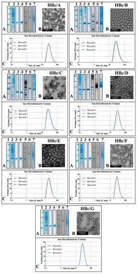 The protein concentration of the purified HBc in the form of VLPs was detected by the Bradford protein assay, and the total yield of the HBc VLPs was calculated (Table 1). The highest yield of HBc VLPs (as mg/g of wet cells) was observed for the HBc of genotypes D and G. All the HBc VLPs contained packaged nucleic acids (Figure 3A, line 6). The characterization of the purification process is given in Figure 3, and a summary of the HBc expression/purification data is presented in Table 1.