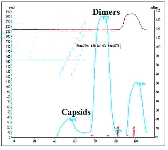 HBc/D, HBc/G, and HBc/F VLPs were selected for the dissociation–reassociation of HBc VLPs. In this study, VLPs were dissociated using dissociation buffer containing GuHCl and LiCl. After incubation in the GuHCl-containing buffer, part of the VLPsremained in sediment. After the removal of the debris, the supernatant was loaded on a Superdex200 column to separate the dimers from the non-dissociated capsids and other impurities. The results of the representative separation are shown in Figure 4. The results show that the supernatant mostly contained dimers (Figure 4). The most effective dissociation was observed for HBc/G (80% of the treated soluble VLPs as dimers), followed by HBc/D (70%) and HBc/F (40%). The dimer purity as determined by SDS-PAGE was generally more than 90% for all three types of HBc.