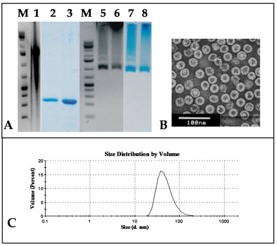 Analysis of HBc/D VLPs packaged with phage PP7 ssRNA. (A) M—NAGE in 2% agarose of GeneRuller 1 kb DNA Ladder (SM1331, Thermo Scientific™, Vilnius, Lithuania) and 1—of phage PP7 RNA; 2, 3—SDS-PAGE of packaged VLPs stained with Coomassie Brilliant Blue R-250; 5–8—NAGE of packaged HBc/D VLPs stained with EtBr; 3, 5, 7—supernatant of the packaged VLP preparation; 2, 6, 8—debris of the packaged VLP preparation. (B) Electron microscopy of the supernatant of the packaged VLP preparation. (C) DLS of the supernatant of the packaged HBc/D VLPs. HBc/D VLPs with packaged phage PP7 ssRNA.