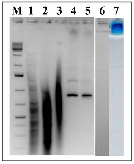 Extraction of RNA from HBc/D VLPs; NAGE in 2% Agarose. M—GeneRuller 1 kb DNA Ladder (SM1331, Thermo Scientific™, Vilnius, Lithuania); 1—dsRNA used for packaging; 2—RNA extracted from packaged HBc/D VLPs; 3—RNA extracted from native HBc/D VLPs; 4—native HBc/D VLPs; 5—HBc/D VLPs packaged with dsRNA; 6, 7—empty HBc/D VLPs; M and 1–6—stained with EtBr; 7—stained with Coomassie Brilliant Blue R250. Note: different amounts of VLPs were loaded into tracks 4 and 6, not corresponding to the amounts of VLPs used for the extraction of RNA (tracks 2 and 3).
