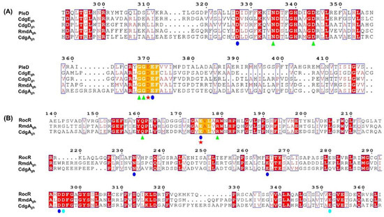 Sequence alignment of RmdAgh and CdgAgh EAL domains compared to RocR showed that both proteins could also function as PDEs. In fact, critical residues essential for catalysis (E175) [40,43,44], substrate binding (Q161 and R179) [40], and metal coordination (E175, N233, E265, D295, D296, and E352) [40,45] are all present and identical among the sequences (Figure 1B). This evidence indicates that CdgAgh as well as RmdAgh possess putative enzymatically active GGDEF and EAL domains, therefore they likely act as bifunctional enzymes.