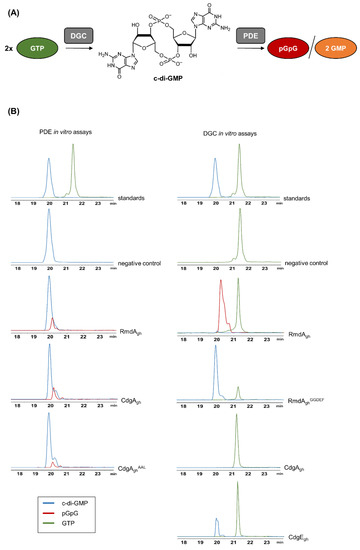 Schematic diagram of cyclic dimeric (3′→5′) GMP (c-di-GMP) synthesis and degradation and LC–MS chromatograms of in vitro phosphodiesterase (PDE) and diguanylate cyclase (DGC) assays. (A) c-di-GMP is synthesized by the DGC enzyme, starting from two molecules of GTP. Instead, PDE enzymes hydrolyze c-di-GMP to linear pGpG or to two molecules of GMP. (B) Upon PDE in vitro assays, the EIC corresponding to the expected [M-H]− ion of pGpG (m/z = 707.1) was detected in both reaction mixtures containing RmdAgh and CdgAgh, respectively, but not in the negative control (without enzyme). Mutation in the conservative EAL domain of CdgAgh (CdgAghAAL) strongly reduced the hydrolytic activity. Upon DGC in vitro assays, the EIC corresponding to the expected [M-H]- ion of c-di-GMP (m/z = 689.1) was detected in the reaction mixtures containing a truncated version of RmdAgh (RmdAghGGDEF), carrying solely its GGDEF domain, and CdgEgh, respectively. No conversion of GTP to c-di-GMP was observed in the reaction mixture containing CdgAgh, whereas the predominant reaction product detected in the mixture containing RmdAgh was pGpG.