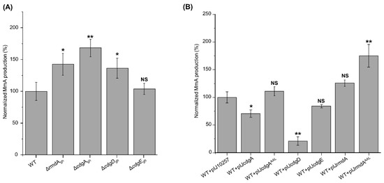3.4. Genetic Manipulation of c-di-GMP-Metabolizing Enzymes Leads to Variations in MmA Accumulation