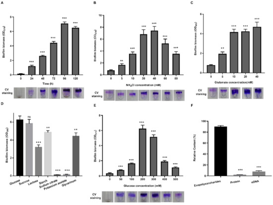 Effects of different nitrogen and carbon sources on biofilm formation of P. polymyxa. WLY78. (A) Biofilm formation of P. polymyxa WLY78 after cultivation in nitrogen-free medium supplemented with 200 mM glucose and 20 mM NH4Cl for different times (h). (B) Effect of NH4Cl concentration on biofilm biomass. (C) Effect of glutamate concentrations on biofilm biomass. (D) Effect of different carbon sources on biofilm biomass. (E) Effect of glucose concentration on biofilm biomass. (F) The relative content of each component in extracellular matrix of P. polymyxa WLY78 grown in nitrogen-free medium supplemented with 200 mM glucose and 20 mM NH4Cl for 60–72 h. “CV” means crystal violet. Results are representative of at least three independent experiments. Error bars indicate SD. Ns indicates nonsignificant. ** indicates p < 0.01. *** indicates p < 0.001.
