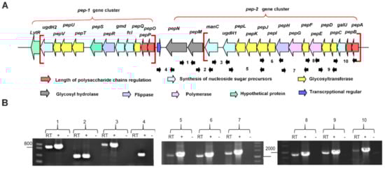 3.3. The pep-2 Gene Cluster Is Involved in Biofilm Formation and Polysaccharide Biosynthesis