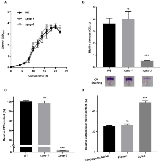 The growth rate, biofilm formation ability and EPS content of P. polymyxa WLY78, ∆pep-1 and ∆pep-2 were comparatively analyzed when they were cultivated in liquid medium. As shown in Figure 3A, there was no obvious difference in growth rates among ∆pep-1, ∆pep-2 and P. polymyxa WLY78. Compared to wild-type P. polymyxa WLY78, the ∆pep-2 mutant produced very low amounts of biofilm and EPS and the ∆pep-1 mutant did not show a significant difference in biofilm biomass and EPS content (Figure 3B,C). In addition, the major component of the extracellular matrix of the ∆pep-2 mutant was eDNA with low amounts of EPS and protein (Figure 3D). The data suggest that the pep-2 gene cluster is responsible for polysaccharide biosynthesis, which is essential for biofilm formation, while the pep-1 gene cluster is not. Further, EPS was purified from P. polymyxa WLY78 and then different amounts of EPS were added to the cultures of the ∆pep-2 mutant. The addition of EPS purified from P. polymyxa WLY78 could not help the ∆pep-2 mutant to form biofilm (Figure S2).